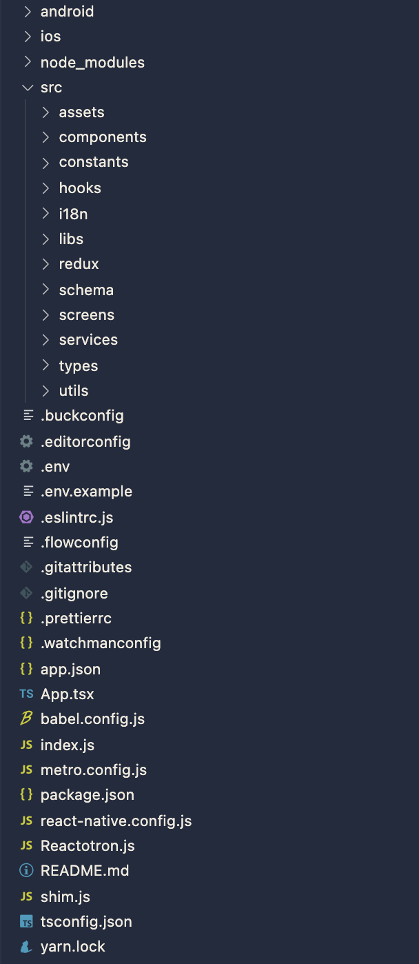 Dưới đây là cấu trúc một dự án mới nhất của mình bao gồm: Typescript, Redux, Reactotron, Apolo Graphql, Sentry, App center, Formik, Onesignal, Svg, Svg charts, Reanimated,...