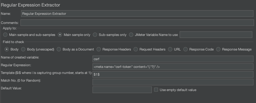 Tôi sử dụng Regular Expression Extractor để lấy giá trị khi response trả về là html. Giá trị cần lấy nằm trong thẻ title, meta, div … chẳng hạn. Để sử dụng ta làm như sau: