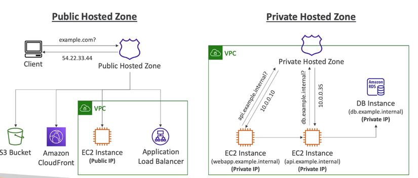 - Public Hosted Zone : Nơi chứa đựng các bản ghi route trên môi trường Internet ( Bạn mua 1 domain xong sau đó add record vào public Hosted Zone , các client mọi nơi trên thế giới đều vào đk thông qua đây)
