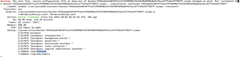 • Sau đó mình check status của process kdevtmpfsi: systemctl status <PID>