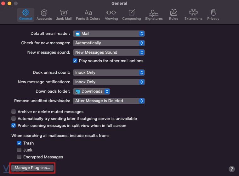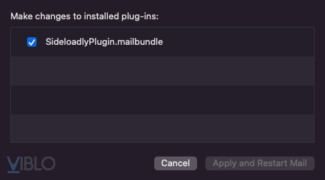 Để bật plugin thì chúng ta truy cập cài đặt tại Mail > Preferences... > General > Manage Plug-ins... Sau đó tích vào ô Sideload.mailbundle, cuối cùng bấm vào nút Apply and Restart Mail là được.