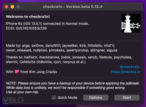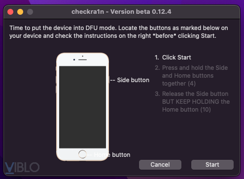 - Bước 3: bấm nút “start” để khởi động quá trình jailbreak trên checkra1n, sau đó làm theo hướng dẫn