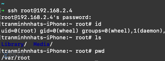 Khi có được địa chỉ IP của thiết bị iphone rồi thì chúng ta có thể SSH vào máy bằng tài khoản root/alpine.