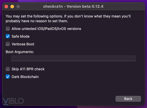 - Bước 2: khởi động checkra1n, trong phần “option” tích chọn safe mode.