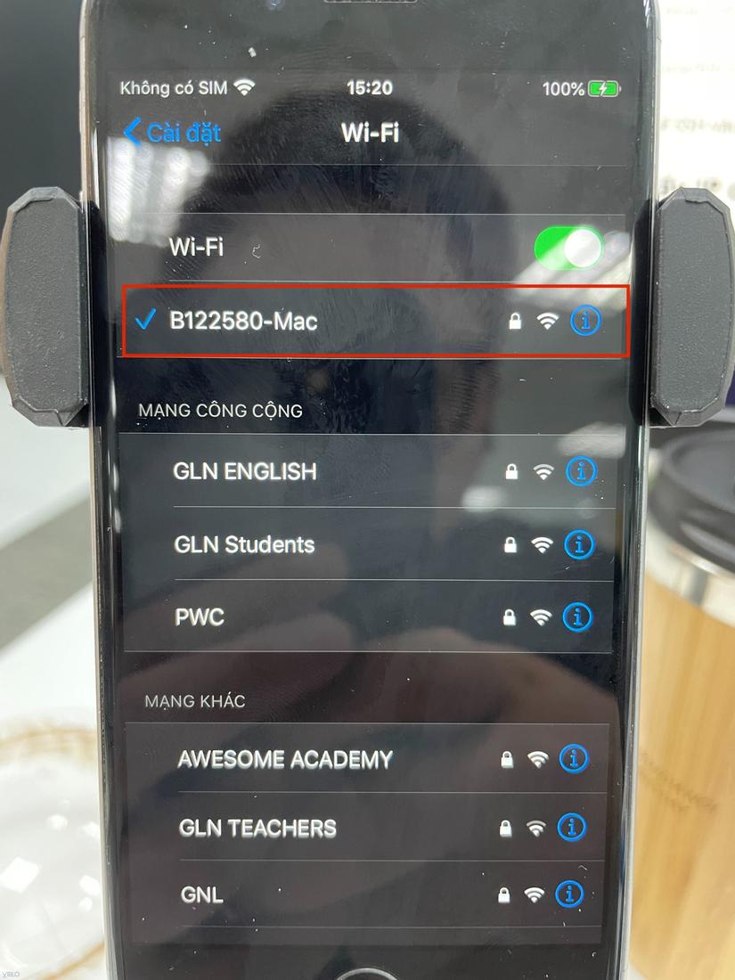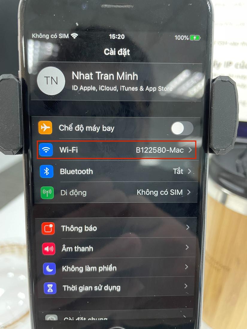 Khi máy tính và thiết bị iphone đã chung một dải mạng rồi, chúng ta sẽ vào phần cài đặt trên thiết bị iphone => chọn mục mạng wifi => chọn cấu hình mạng wifi đang sử dụng.