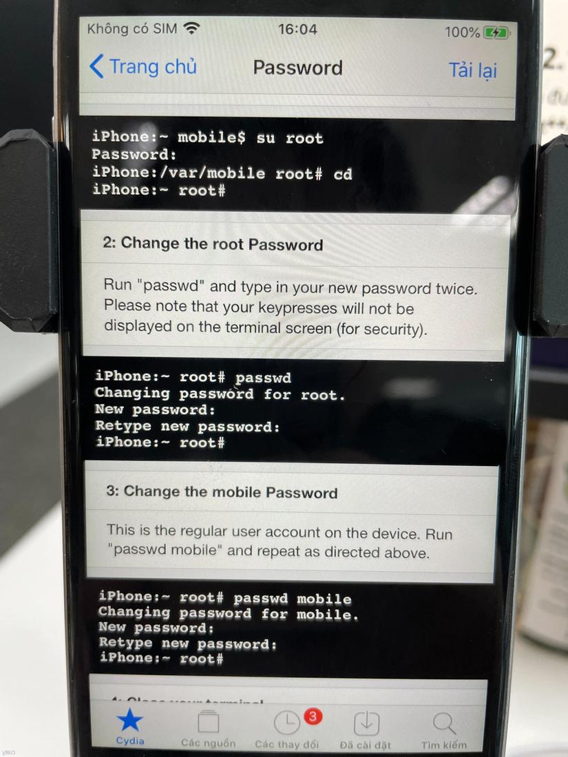 Theo khuyến nghị từ Cydia thì chúng ta nên thay đổi mật khẩu root để tránh việc có người khác SSH được vào thiết bị iphone đã jailbreak của chúng ta. Tuy nhiên mình nghĩ máy test thì cũng chẳng cần thay đổi làm gì vì chúng ta sẽ không kết nối với mạng nào khác trừ mạng wifi do chính chúng ta phát ra. Tuy nhiên nếu muốn yên tâm hơn thì nên đổi mật khẩu tài khoản root bằng command passwd.