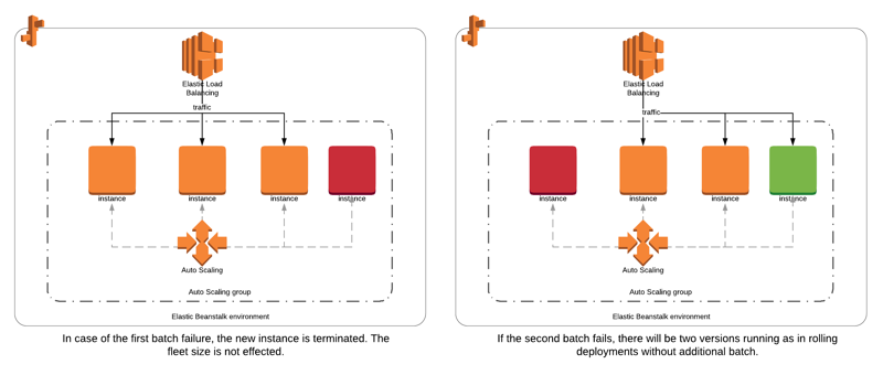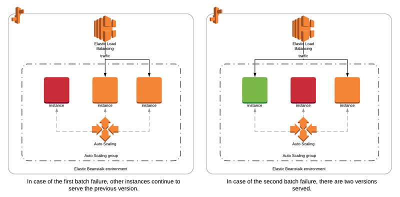 - Nếu sự cố xảy ra ở các batch tiếp theo thì cũng sẽ giống như Rolling mode, các instance trong batch sẽ bị down và hệ thống sẽ chạy cùng lúc cả 2 version cũ và mới của ứng dụng. Tuy nhiên fleet size của hệ thống không bị giảm.