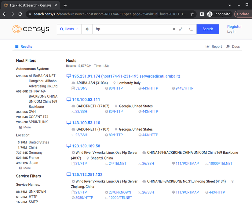 Censys được tạo ra vào năm 2015 tại Đại học Michigan bởi chính các nhà nghiên cứu bảo mật đã tạo ra ZMap. Dự án ZMap (https://zmap.io) cung cấp thông tin và công cụ hữu ích hỗ trợ quét và đo lường quy mô lớn trên toàn Internet. Giống như Shodan, Censys (https://censys.io) là một công cụ tìm kiếm chuyên dụng duy trì dữ liệu nghiên cứu Internet công khai và cung cấp giao diện người dùng dựa trên web để truy vấn các bộ dữ liệu như địa chỉ IPv4, trang web và chứng chỉ web. Bạn có thể khởi chạy giao diện tìm kiếm cho từng bộ dữ liệu này trực tiếp từ trang web của Censys bằng các liên kết sau: