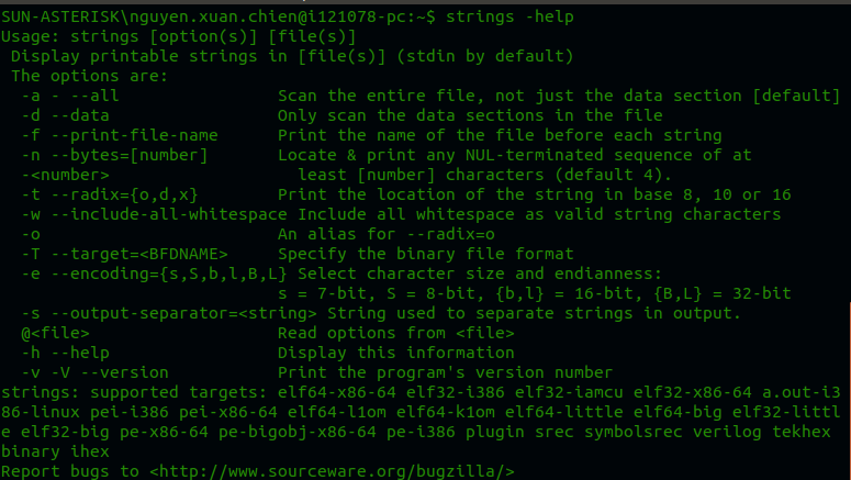 Strings là một chương trình command-line được sử dụng được sử dụng để trả lại các ký tự chuỗi vào tệp. Nó chủ yếu tập trung vào việc xác định nội dung và trích xuất văn bản từ các tệp nhị phân (tệp không phải văn bản).