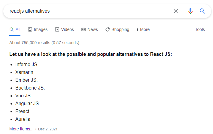Ví dụ, tìm framework tương đương React JS: