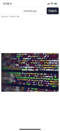 When we’ve detected that reduced-size assets are desired, as described above, we add a request header Save-Data: on to each HTTP request that we send. If regular-sized assets are desired, we omit this header altogether. The sample app uses the Apple URL Loading System, embodied by NSURLSession and NSURLSessionTask objects, to load web-hosted assets. All we need to do is configure an NSURLSession object with the additional request header field as required, as shown in this code snippet: