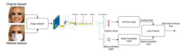 Có thể thấy lúc này, mô hình sẽ tạo ra 2 outputs, 1 cho việc sinh ra feature vector (tạo ra logits ArcFace), 1 cho việc nhận biết masked và non-masked (tạo ra logits Mask), tương ứng với nó sẽ là 2 hàm loss tương ứng: