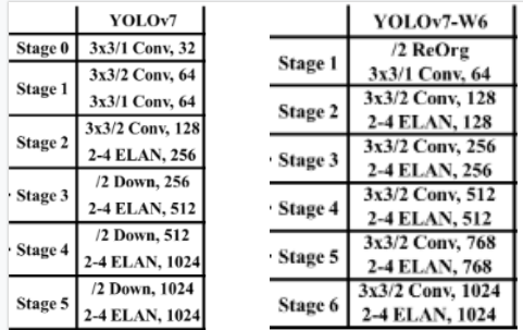 Bảng 1. YOLOv7 chỉ có 5 stage trong backbone, còn YOLOv7-w6 có tới 6 stage