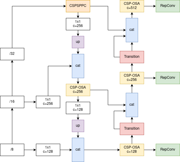 • Neck: SPPCSPC + (CSP-OSA)PANet (YOLOv7-p5, YOLOv7-p6) + RepConv