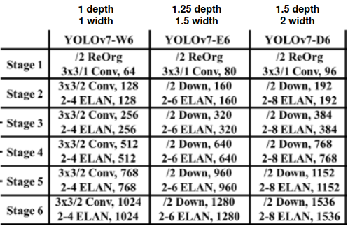 Luật scale của YOLOv7-p5 vẫn được áp dụng cho YOLOv7-p6. Lấy gốc là YOLOv7-w6, số channels và số layer của computation block trong ELAN Block của YOLOv7-w6 giống với YOLOv7. Tuy nhiên, điểm khác biệt của YOLOv7-w6 so với YOLOv7 là số stage trong backbone (Bảng 1)
