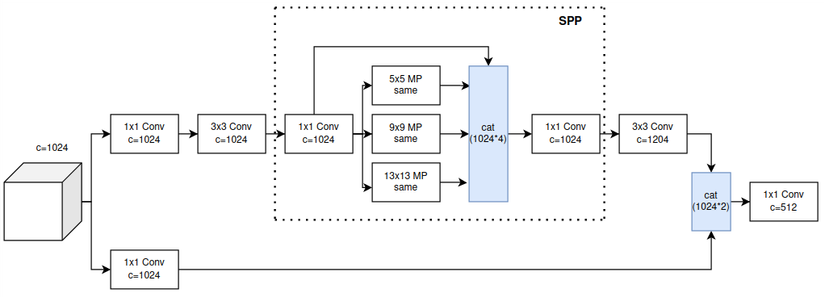 Có 1 điều khá lạ ở SPPCSPC đó chính là 2 đường đều có số channels bằng với số channels trong feature maps ban đầu, thay vì là một nửa như CSP thông thường.