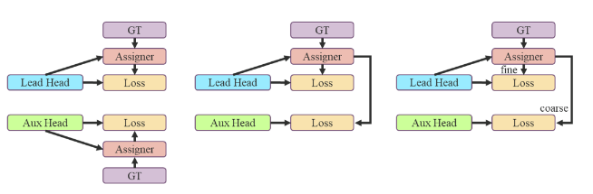 Hình 11. Các cách sử dụng Auxiliary Head. Assigner là quá trình Label Assignment, GT là ground truth, Aux Head là Auxiliary Head, Lead Head là head sẽ dùng để đưa ra kết quả prediction trong quá trình inference