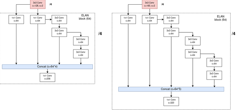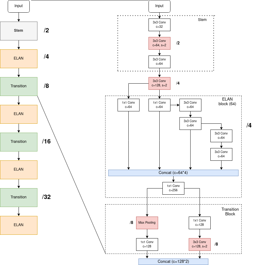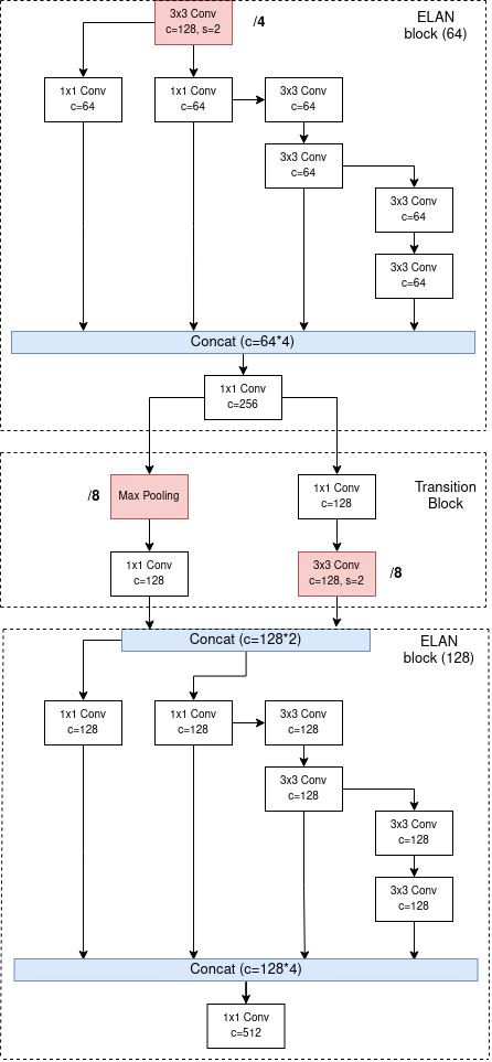 Các ELAN Block được kết nối với nhau thông qua các Transition Block (Hình 2). Mỗi Transition Block là một lần giảm kích cỡ của feature maps đi 2 lần.