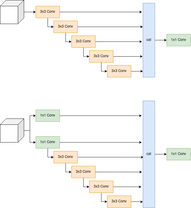 Hình 7. Bên trên là OSA module thông thường trong VoVNet, bên dưới là CSP-OSA module sử dụng trong neck của YOLOv7