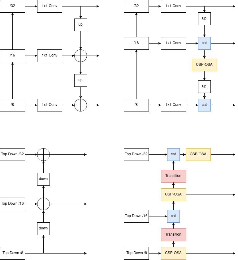 Hình 6. Sự khác biệt của (CSP-OSA)PANet (phải) so với PANet thông thường (trái). Trong Top Down pathway của PANet thông thường (trên trái) chỉ là một FPN, các feature maps từ backbone ở scale phía trên được kết hợp trực tiếp với scale phía dưới mà không thông qua bất kì sự xử lý nào thêm. Còn trong Top Down pathway của YOLOv7, feature maps từ scale /16 sau khi được kết hợp với feature maps từ scale /8 sẽ được xử lý thêm thông qua CSP-OSA module rồi mới kết hợp với scale /8. Điều tương tự cũng xảy ra với Bottom Up pathway của YOLOv7, feature maps từ scale dưới sẽ được đi qua CSP-OSA để xử lý, và downsample thông qua Transition Block mà mình đã nói ở trên backbone thay vì là 3×3 Conv như PANet thông thường.