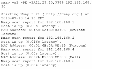 Chúng ta thấy kết quả trả về khá chi tiết với các máy tính có địa chỉ IP 192.168.168.1, 192.168.168.2, 192.168.168.4 và 192.168.168.6 đang hoạt động. Các công cụ Ping Sweep khác thường được sử dụng là Angry IP Scanner và