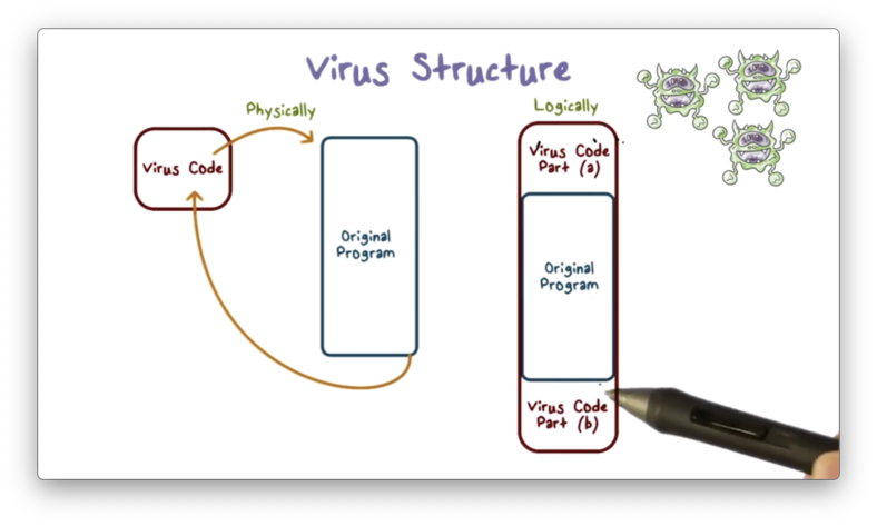 Virus lây nhiễm vào chương trình bằng cách sửa đổi mã chương trình. Để đạt được điều này, mã virus phải được chèn vật lý vào tệp chương trình. Khi một chương trình bị nhiễm chạy, mã virus sẽ chạy trước, sau đó virus sẽ kích hoạt chạy chương trình gốc để người dùng không nghi ngờ rằng chương trình đã bị nhiễm. Cuối cùng, virus chạy lại để thực hiện một số dọn dẹp nhằm tránh bị phát hiện.