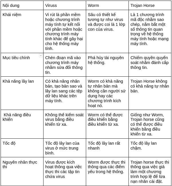Worm, Virus và Trojan có khá là nhiều điểm tương đồng, và nhiều người dễ nhầm lẫn khi phân biệt 3 loại trên. Vậy nên mình đã làm 1 bảng tóm gọn lại khái niệm cũng như sự khác biệt giữa 3 loại trên để bạn đọc dễ hình dung: