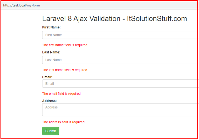 <!DOCTYPE html><html><head><title>Laravel 8 Ajax Validation</title><link rel="stylesheet" href="https://cdnjs.cloudflare.com/ajax/libs/twitter-bootstrap/3.3.7/css/bootstrap.min.css"/><script src="https://cdnjs.cloudflare.com/ajax/libs/jquery/3.2.1/jquery.js"></script><style type="text/css">.error_msg {color: red;}</style></head><body><div class="container"><h2>Laravel 8 Ajax Validation</h2><div class="alert alert-danger print-error-msg" style="display:none"><ul></ul></div><form>{{csrf_field()}}<div class="form-group"><label>First Name:</label><input type="text" name="first_name"class="form-control" placeholder="First Name"></div><p class="error_msg" id="first_name"></p><div class="form-group"><label>Last Name:</label><input type="text" name="last_name"class="form-control" placeholder="Last Name"></div><p class="error_msg" id="last_name"></p><div class="form-group"><strong>Email:</strong><input type="text" name="email"class="form-control" placeholder="Email"></div><p class="error_msg" id="email"></p><div class="form-group"><strong>Address:</strong><textarea class="form-control" name="address" placeholder="Address"></textarea></div><p class="error_msg" id="address"></p><div class="form-group"><button class="btn btn-success btn-submit">Submit</button></div></form></div><script type="text/javascript">