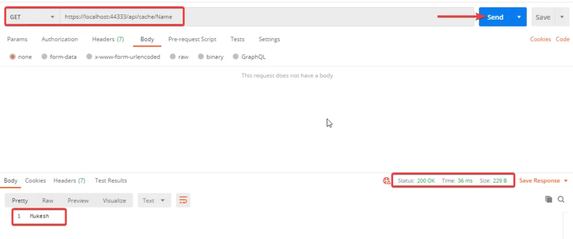 Hãy tưởng tượng rằng chúng ta đã sử dụng Phương thức POST để set giá trị cho Cache. Giả sử các giá trị là, Key = “Name”, Value = “Mukesh”. Sau đó,cũng sẽ cần một phương thức để truy xuất nó.