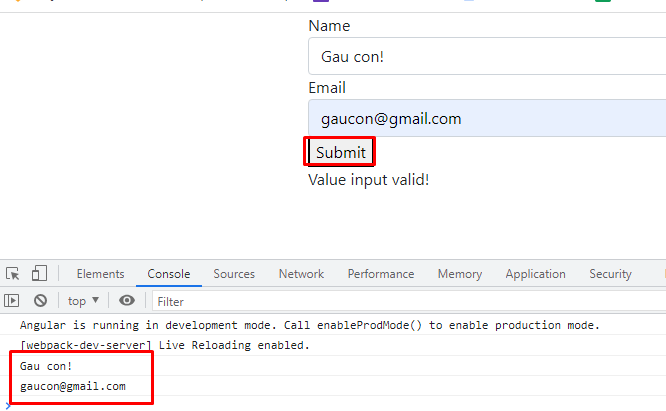 <div class="container"><form #itemForm="ngForm"(ngSubmit)="onSubmit(itemForm)"><label for="name">Name</label><input type="text" id="name"class="form-control" name="name" ngModel required /><label for="name">Email</label><input type="text" id="email"class="form-control" name="email" ngModel required /><button type="submit">Submit</button></form><div [hidden]="!itemForm.form.valid"><p>{{ submitMessage }}</p></div></div>