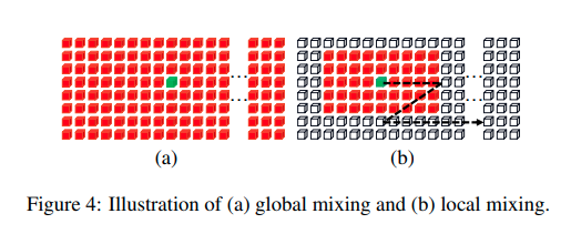 Local mixing dùng để biểu diễn mối quan hệ giữa các nét trong cùng một kí tự. Điều này đặc biệt ý nghĩa đối với các chữ có kí tự phức tạp như tiếng Nhật. Như hình trên bạn có thể thấy chỉ một chút khác nhau về độ dài ngắn giữa các nét cũng đã đủ tạo ra một chữ khác. Locall mixing cũng sử dụng cơ chế window slide trượt trên các vùng kích thước 7×117 times 11 và tính toán mối liên hệ giữa các phần tử trong vùng cửa sổ đó. Chú ý một chút các phần tử ở đây chính là các phần tử được chia qua lớp Patch Embedding được trình bày bên trên.