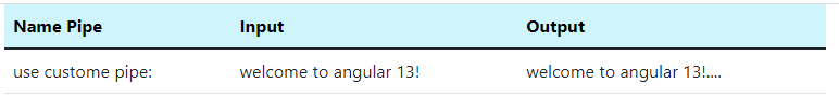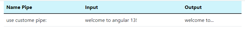 <div class="container"><div class="col col-lg-7"><table class="table"><thead><tr class="table-info"><th scope="col">Name Pipe</th><th scope="col">Input</th><th scope="col">Output</th></tr></thead><tbody><tr><td>use custome pipe:</td><td>{{ text }}</td><td>{{ text | truncate }}</td></tr></tbody></table></div></div>