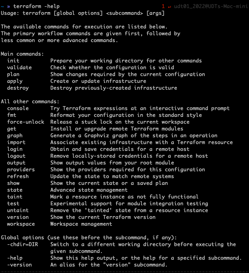 Để xem danh sách các commands có trong terraform có thể dùng cmd terraform -help . Kết quả sẽ như sau: