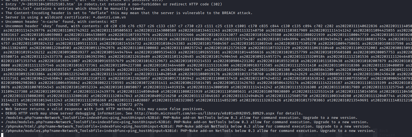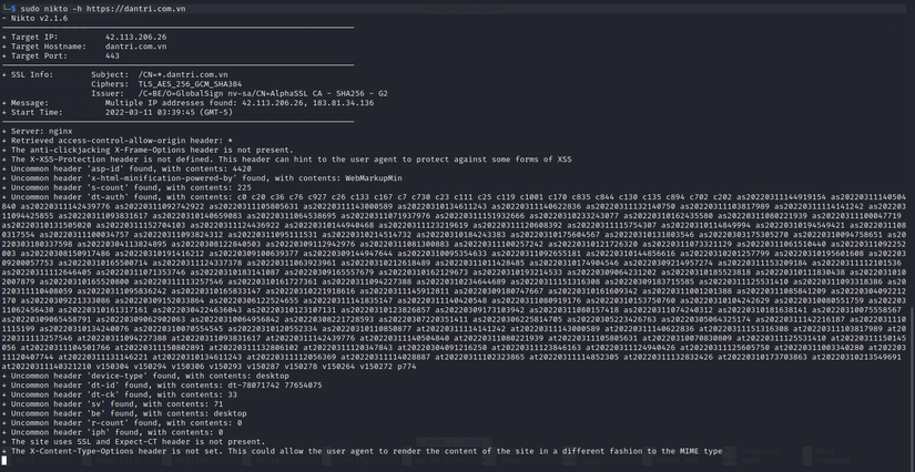 Quét sơ qua thì thông tin trả về cho thấy trang dantri sử dụng web server: nginx. Trang web không thực hiện bảo mật clickjacking dẫn tới trang web có thể bị hacker lợi dụng lỗi hổng trên để khai thác. Bên cạnh đó nikto còn phát hiện ra file robots.txt cũng như rất nhiều các phiên bản cần được update.