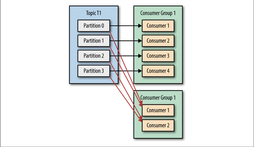 - Nếu chúng ta tạo consumer C2 trong group G1, mỗi consumer C1,C2 sẽ chỉ nhận message từ 2 partition ngẫu nhiên.