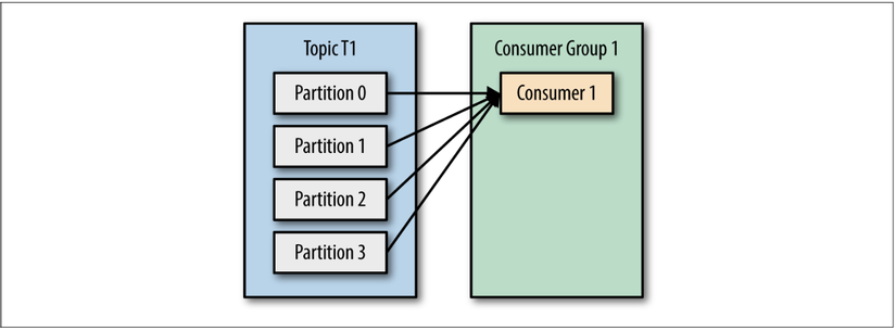 - Bây giờ ta có 1 topic T1 có 4 partition. Giả sử chúng ta tạo consumer C1 và chỉ có duy nhất consumer C1 group G1, và use sử dụng C1 để subscribe đến topic T1, lúc này C1 sẽ nhận tất cả message từ 4 partition.