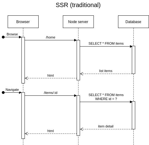 - SSR là server sẽ render ra trang HTML có sẵn nội dung, sau đó browser load trang HTML có sẵn nội dung này thì chỉ cần hiển thị ra và làm cho content có thể tương tác được thôi.
