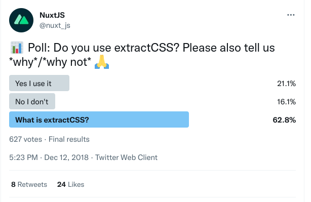 Option này sẽ cấu hình để Nuxt (hay cụ thể là webpack) tách CSS của bạn ra những file riêng. Những file này thì có thể cache thoải mái trên Browser (đối với 1 user F5), Proxy hay CDN (đối với nhiều user cùng truy cập). Nó không khó tuy nhiên vì không được set mặc định nên nhiều người không để ý. Hãy thử xem 1 cái vote hồi 2018 của NuxtJS về tính năng này xem có bao nhiêu người để ý đến nó nhé: