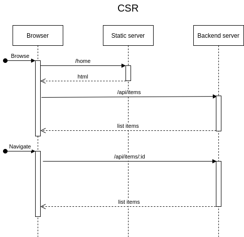 - CSR là client sẽ load 1 trang HTML chỉ có code không có nội dung về dưới browser, sau đó mới chạy JS để render ra nội dung trang web.