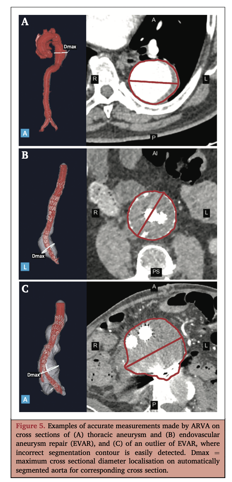Methods: Accurate external aortic wall diameter measurement is performed along the entire aorta, from the ascending aorta to the iliac bifurcations, on both pre- and post-operative contrast enhanced computed tomography angiography (CTA) scans. A training database of 489 CTAs was used to train a pipeline of neural networks for automatic external aortic wall measurements. Another database of 62 CTAs, including controls, aneurysmal aortas, and aortic dissections scanned before and/or after endovascular or open repair, was used for validation. The measurements of maximum external aortic wall diameter made by ARVA were compared with those of seven clinicians on this validation dataset.