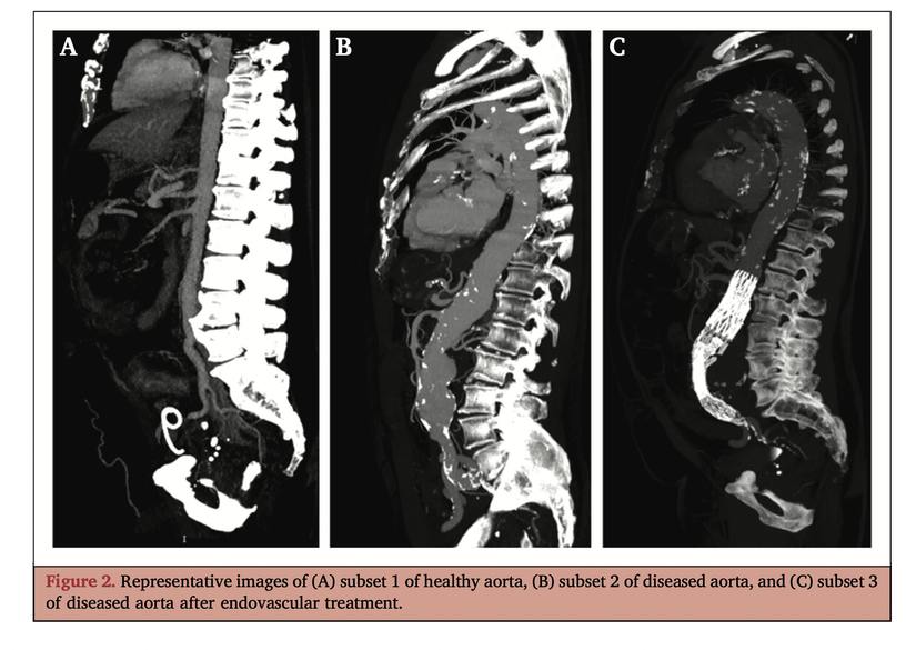 While the Dice score is widely used in the data science community, it does not fully represent clinical reality as medical decisions are based on the maximum aneurysm diameter. A high Dice score does not ensure an accurate measurement. Thus, the segmentation might be precise everywhere in the aorta except in the aneurysm sac where measurements are taken. This example leads to a high Dice score but to incorrect diameters. Therefore, maximum diameter measurement error is reported.