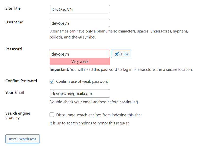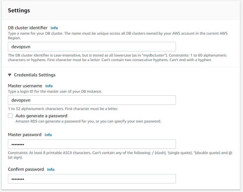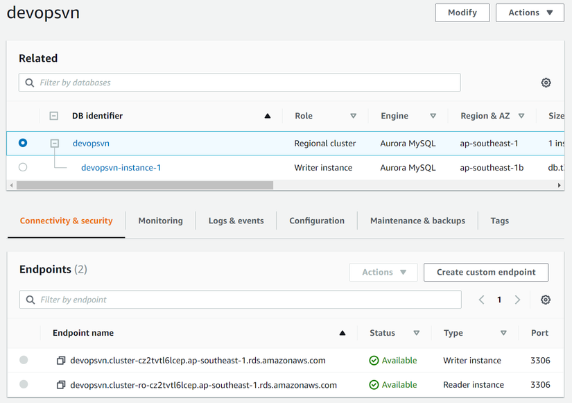 define('DB_NAME','devopsvn');/** Database username */define('DB_USER','devopsvn');/** Database password */define('DB_PASSWORD','devopsvn');/** Database hostname */define('DB_HOST','devopsvn.cluster-cz2tvtl6lcep.ap-southeast-1.rds.amazonaws.com');