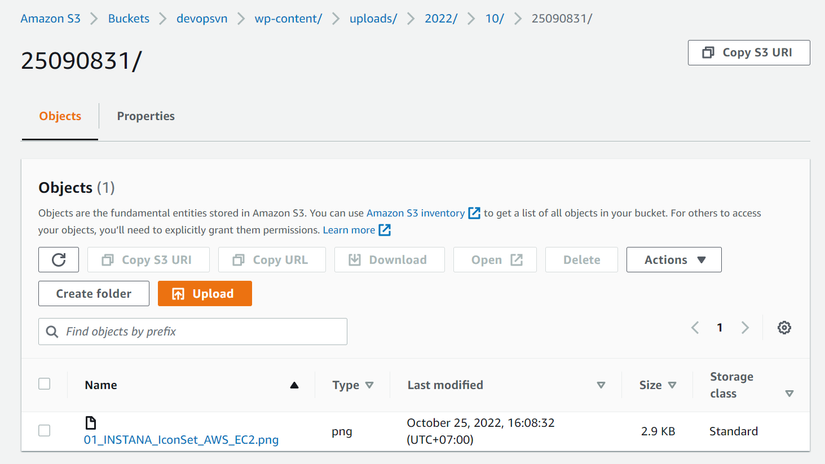 Thử upload hình bất kì ta sẽ thấy nó được sao chép lên trên S3 bucket.
