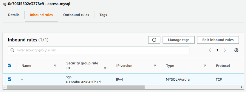 Trong khi đợi RDS tạo, ta cần cập nhật lại Security Group ta đã tạo ở trên để từ EC2 ta có thể truy cập được RDS, nó tên là access-mysql. Ở EC2 Dashboard các bạn bấm vào mục Security Groups, bấm vào access-mysql và chọn Edit inbound rules.
