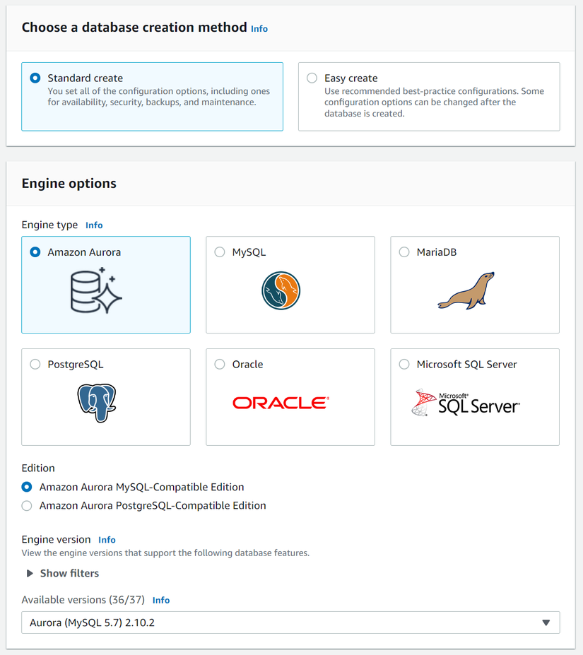 - Mục Configuration, phần Engine type chọn Amazon Aurora và Version ta chọn Aurora MySQL bản 5.x