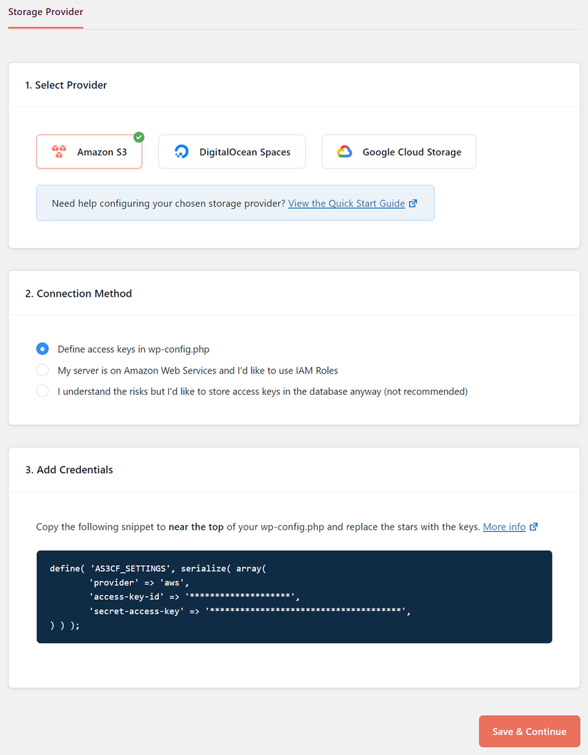 Ta thêm đoạn code trên với access-key-id và secret-access-key vào wp-config.php. Các bạn xem cách tạo AWS Credentials ở đây Creating your first IAM admin user and user group.