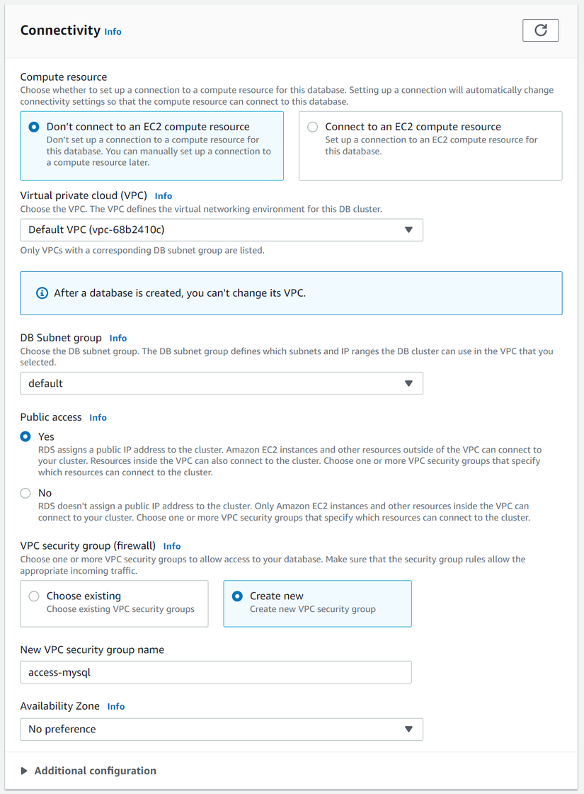 - Mục Connectivity các bạn để như hình bên dưới, còn ở phần VPC security group (firewall) các bạn chọn Create new và điền vào tên bạn muốn, mình điền là