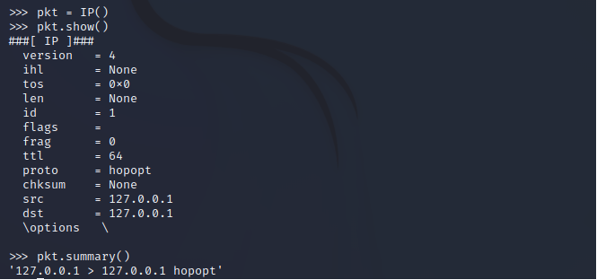 Ví dụ dưới đây mình sẽ tạo ra 1 gói tin với layer IP, thực hiện 2 func show và sumary.
